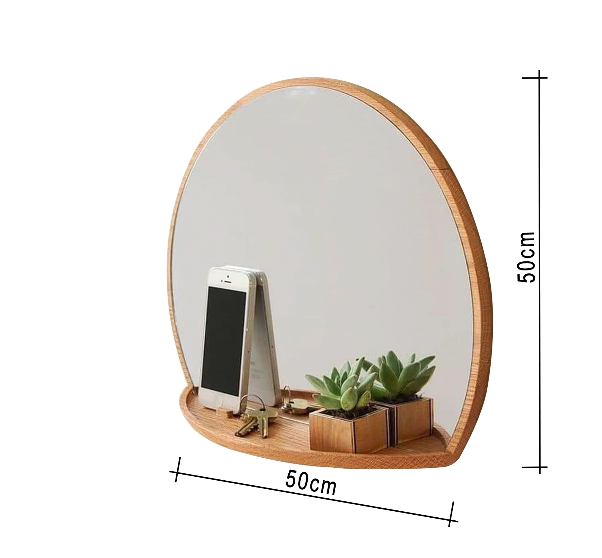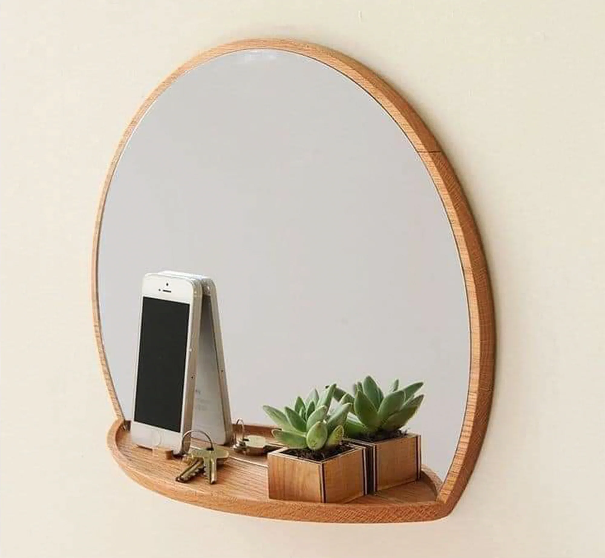 For the lobby of your home, practical small pieces that add touches of beauty and sophistication to your home. This is a semi-circular mirror with a shelf for your keys with a frame and a wooden shelf in an elegant beige color
